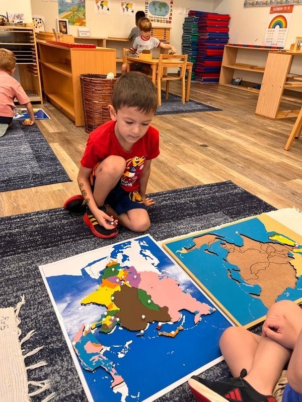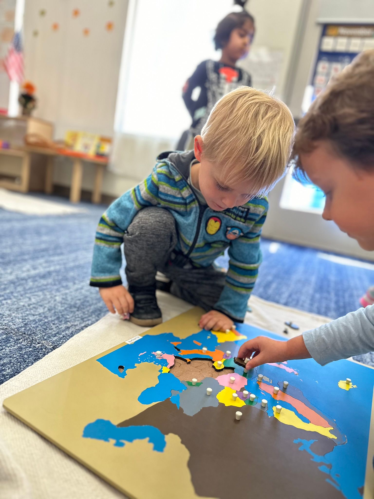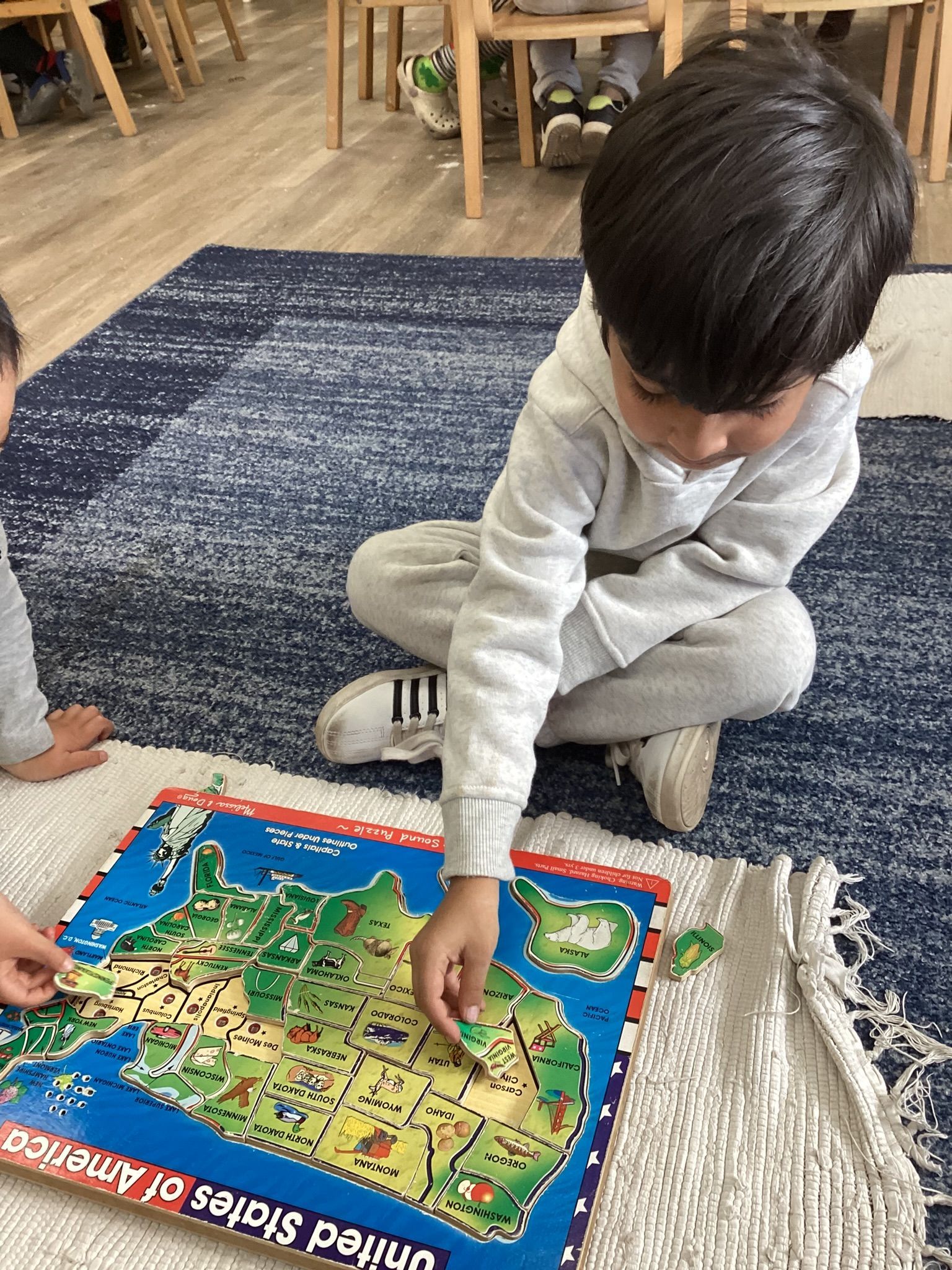 We also explored South America, locating it on the map and identifying it by its pink color. The children discovered that the primary languages spoken in South America are Spanish and Portuguese. Spanish is the official language in most South American countries, while Portuguese is spoken in Brazil.
