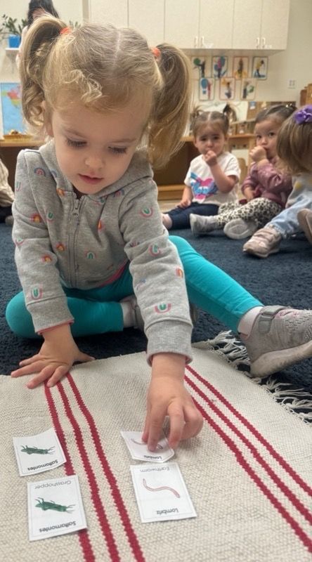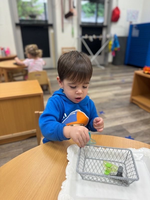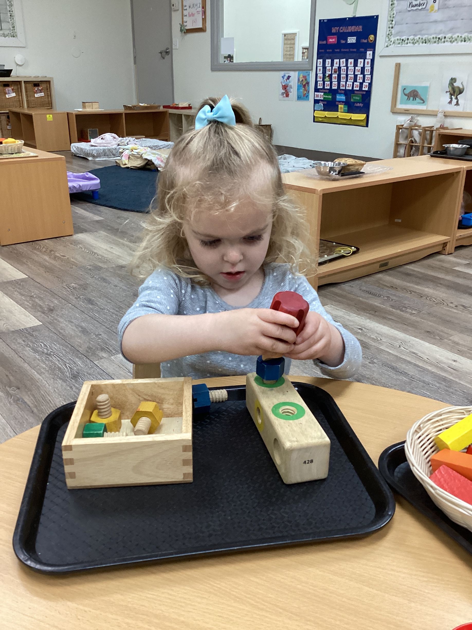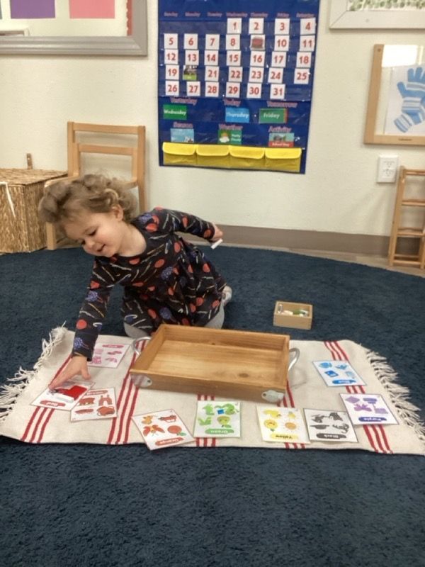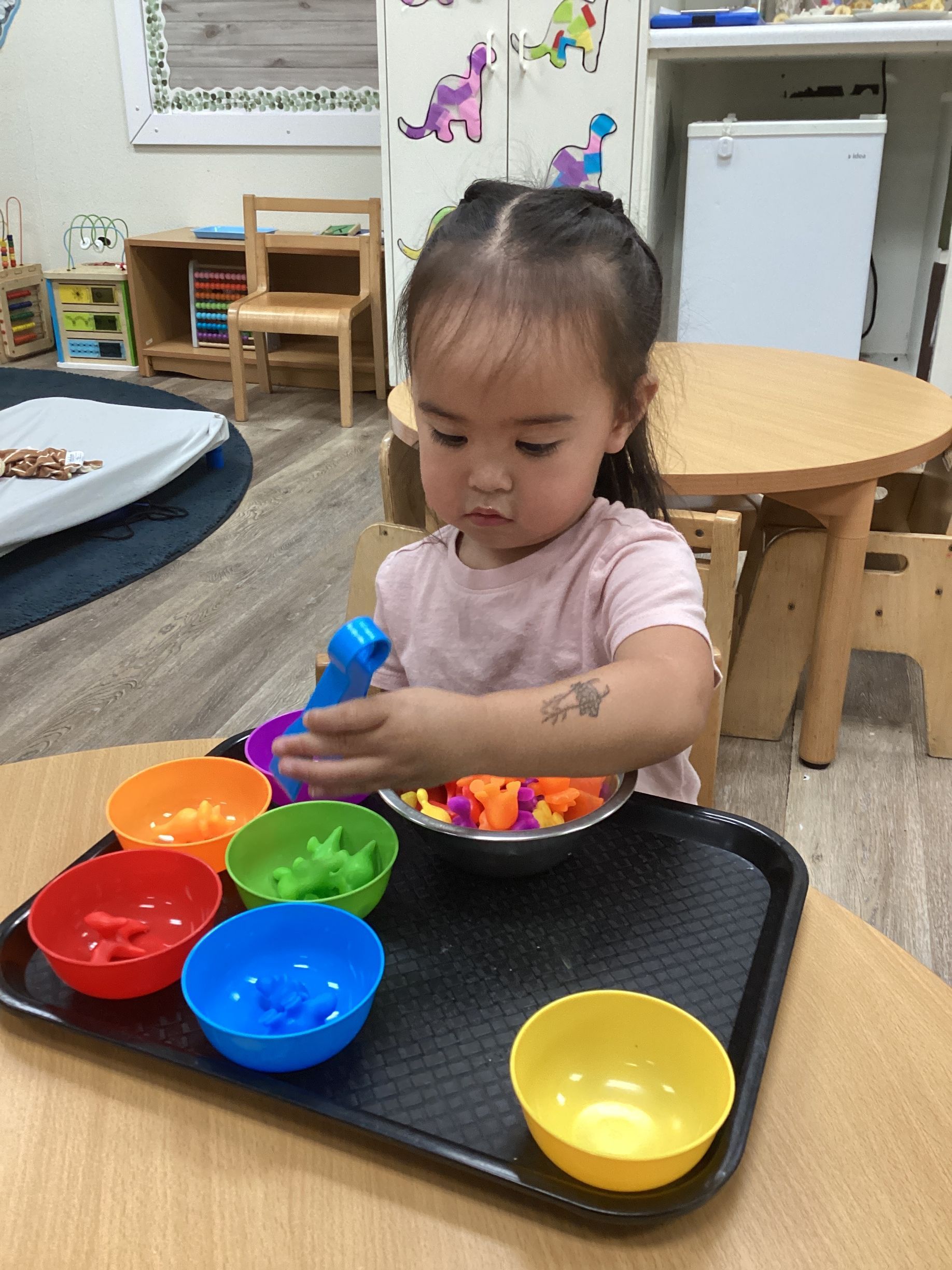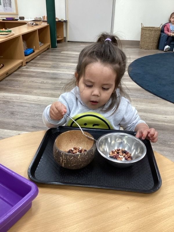 During circle time we sang songs like, “The Wheels on the Bus”, “The More we get Together”, and “I Love You, You Love me”. We practiced the numbers 1-4 in English and Spanish. We also use this time to demonstrate how to do a proper work cycle by grabbing work, taking it to the table and putting it back on the shelf. This month we had the children work on spooning balls from one bowl to another bowl.