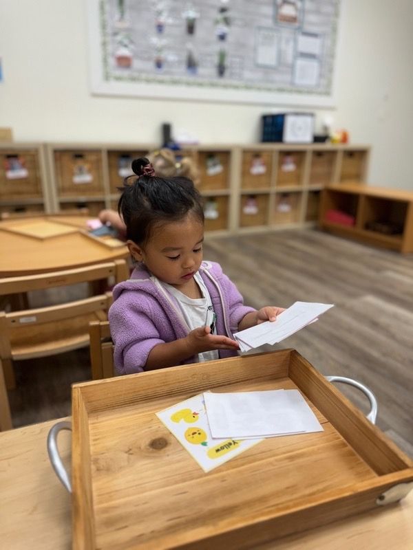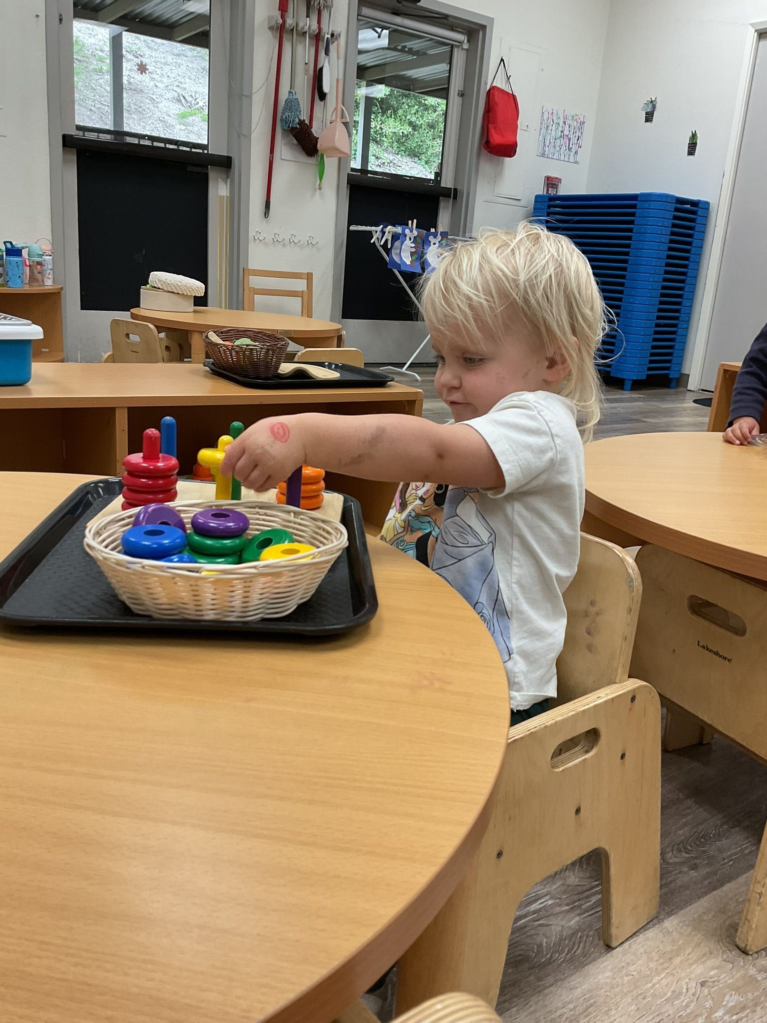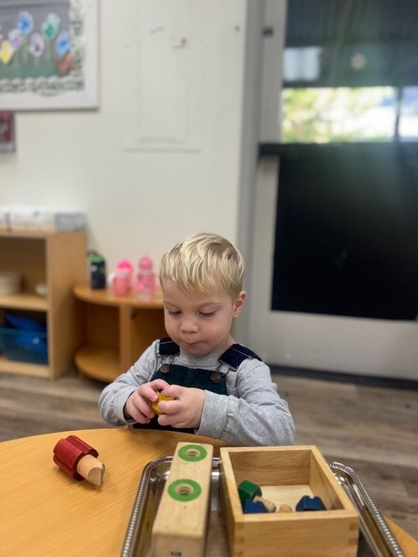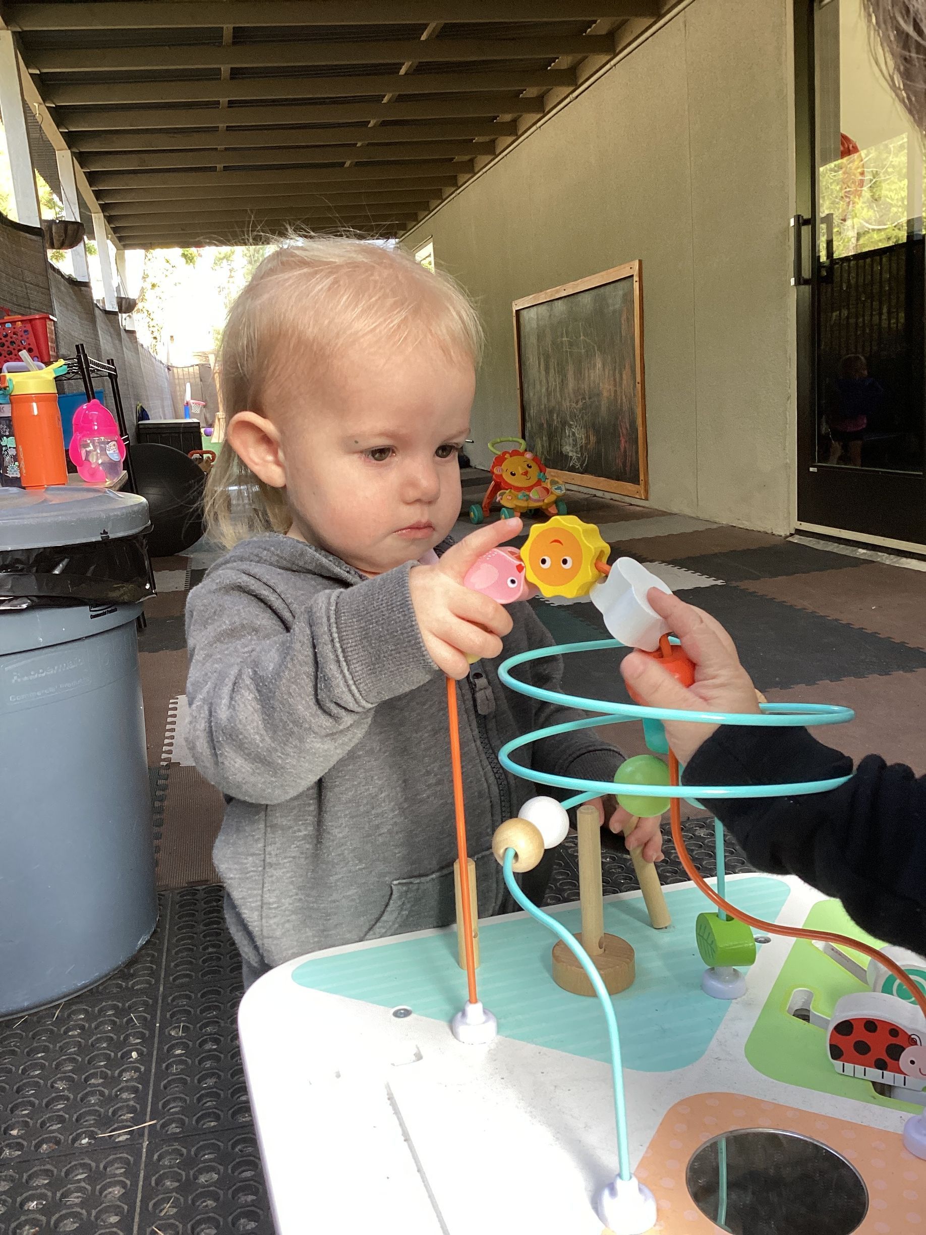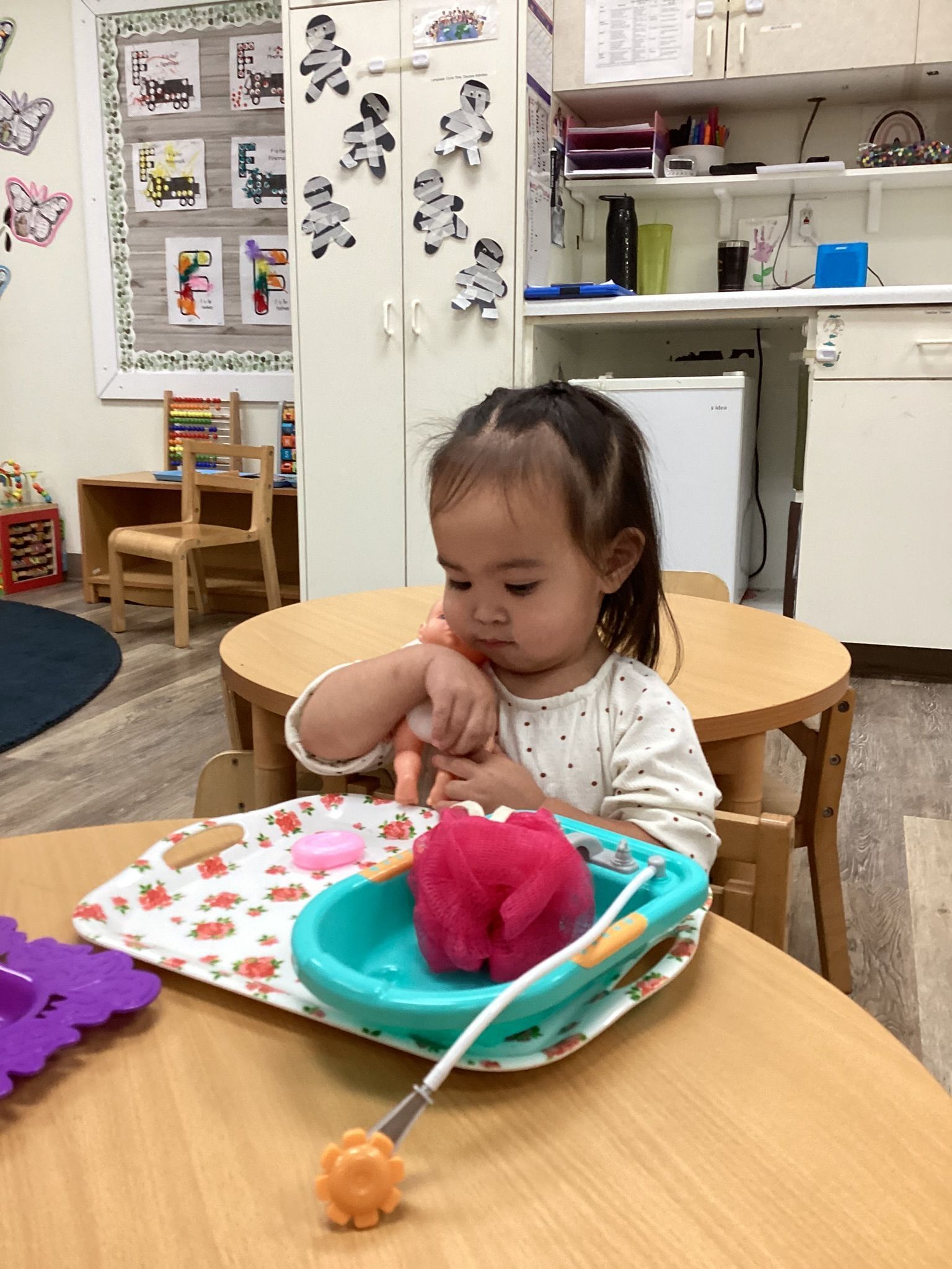 During circle time we sang songs like, “The Wheels on the Bus”, “The More we get Together”, and “I Love You, You Love me”. We practiced the numbers 1-4 in English and Spanish. We also use this time to demonstrate how to do a proper work cycle by grabbing work, taking it to the table and putting it back on the shelf. This month we had the children work on spooning balls from one bowl to another bowl.