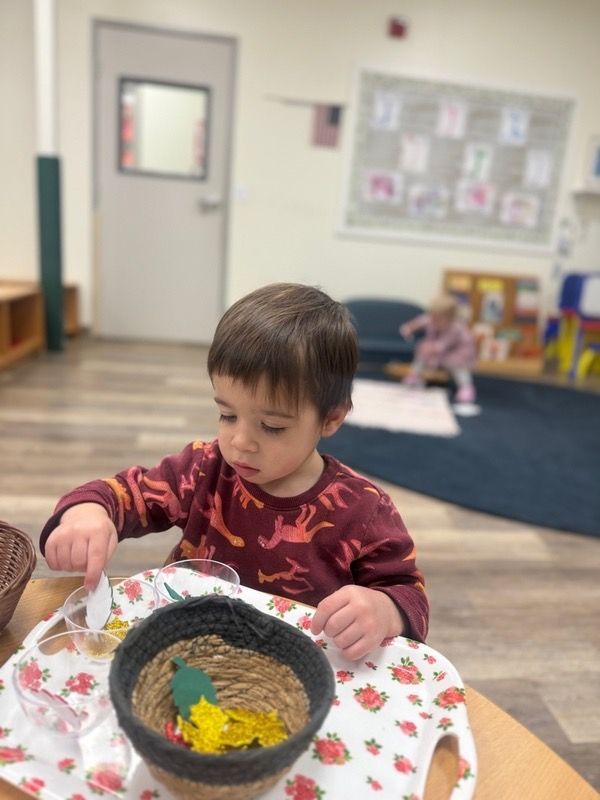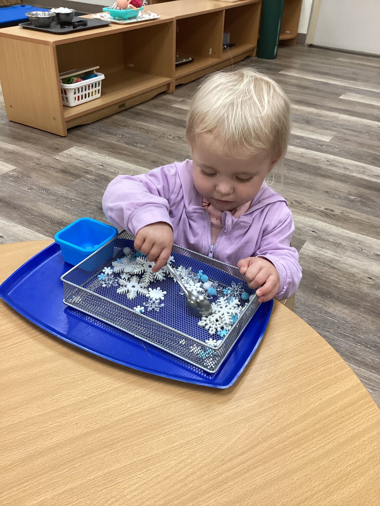 This month's book, The Mitten, is a heartwarming story about a boy named Nicki who loses his mitten in the snow. A simple lost mitten transforms into a cozy haven for a parade of forest animals, each looking for warmth during the icy winter. The children loved all the new workstations for the winter theme. They had a spooning activity with fake snowballs made of Styrofoam. We also had work that focused on using tongs to pick up the snowflakes from one bowl to the other to work on their hand motor skills.