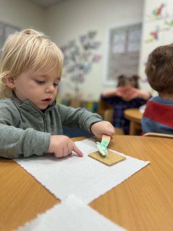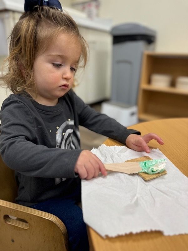 Our letters for the month were S, T, U, and V and learned its phonics. Our literature book for February was Little Blue and Little Yellow. The book is about friendship and explains that we don’t have to be the same to be good friends. After reading the book, the children had the chance to see what happens when we mix blue and yellow paint, just like in the story. Enrichment was a lot of fun! In Spanish the children learned how to say friends-amigos, heart-corazon, and flowers-flores. In music we learned about Johannes Brahms and listened to the music he composed. For cooking we made a fruit salad and a friendship trail mix. The children also got to practice slicing bananas.