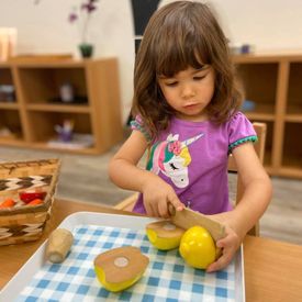 Exercises of Practical Life develop independence, concentration, self-control and physical coordination of the children. When the children are able to perform these exercises, they develop self-respect and self-esteem as they gain finer motor skills and self-control. The children also acquire social awareness that enables them to interact and cooperate with other children when they are working together in the classroom environment.