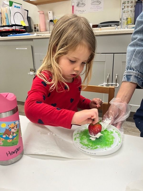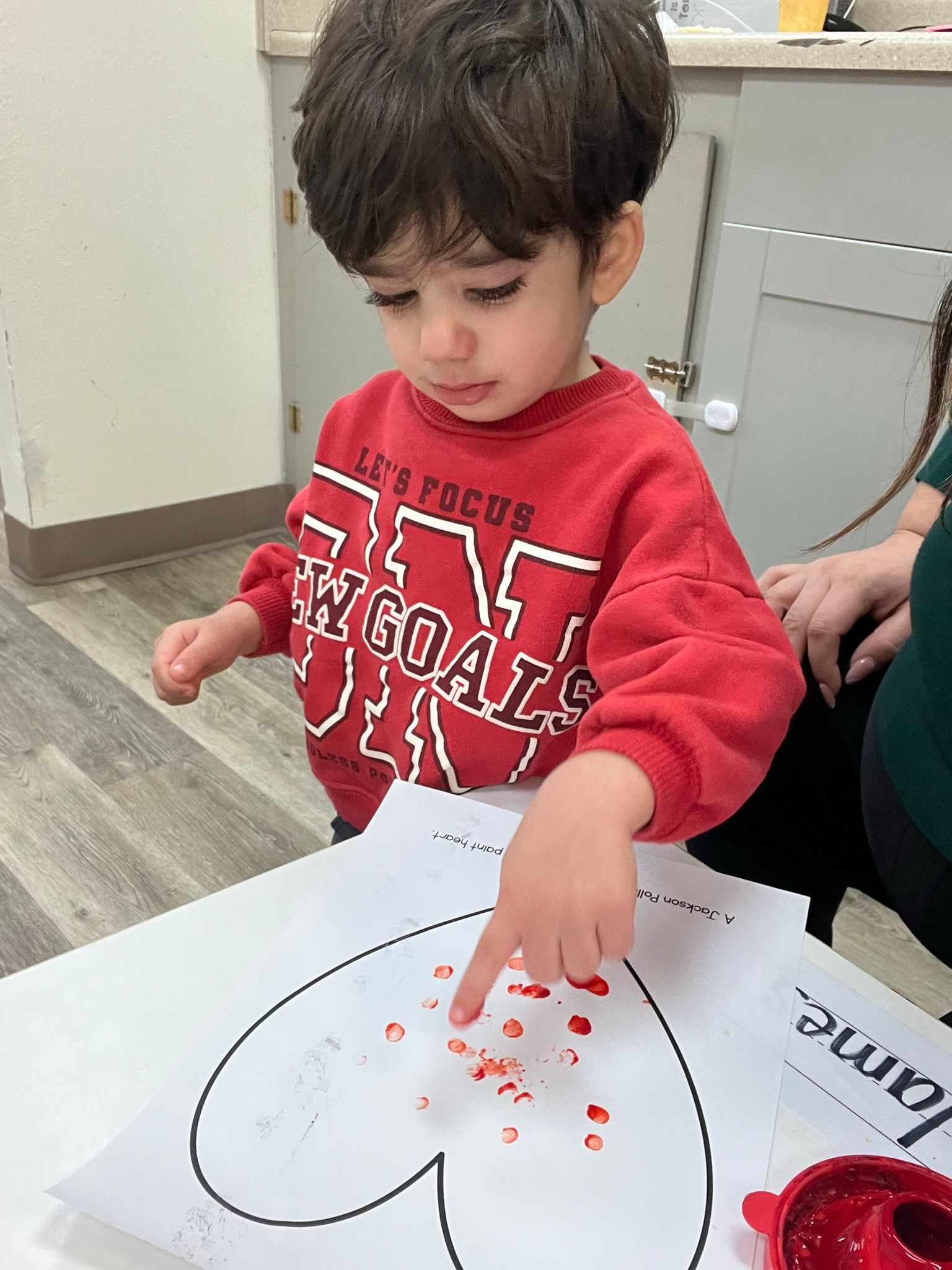 For enrichment in Spanish students practiced the letters H, I, G, F in Spanish and even traced those letters. For art students completed a finger painting in the shape of a heart for our Valentine's celebration. For cooking, students made their own friendship fruit bowl!