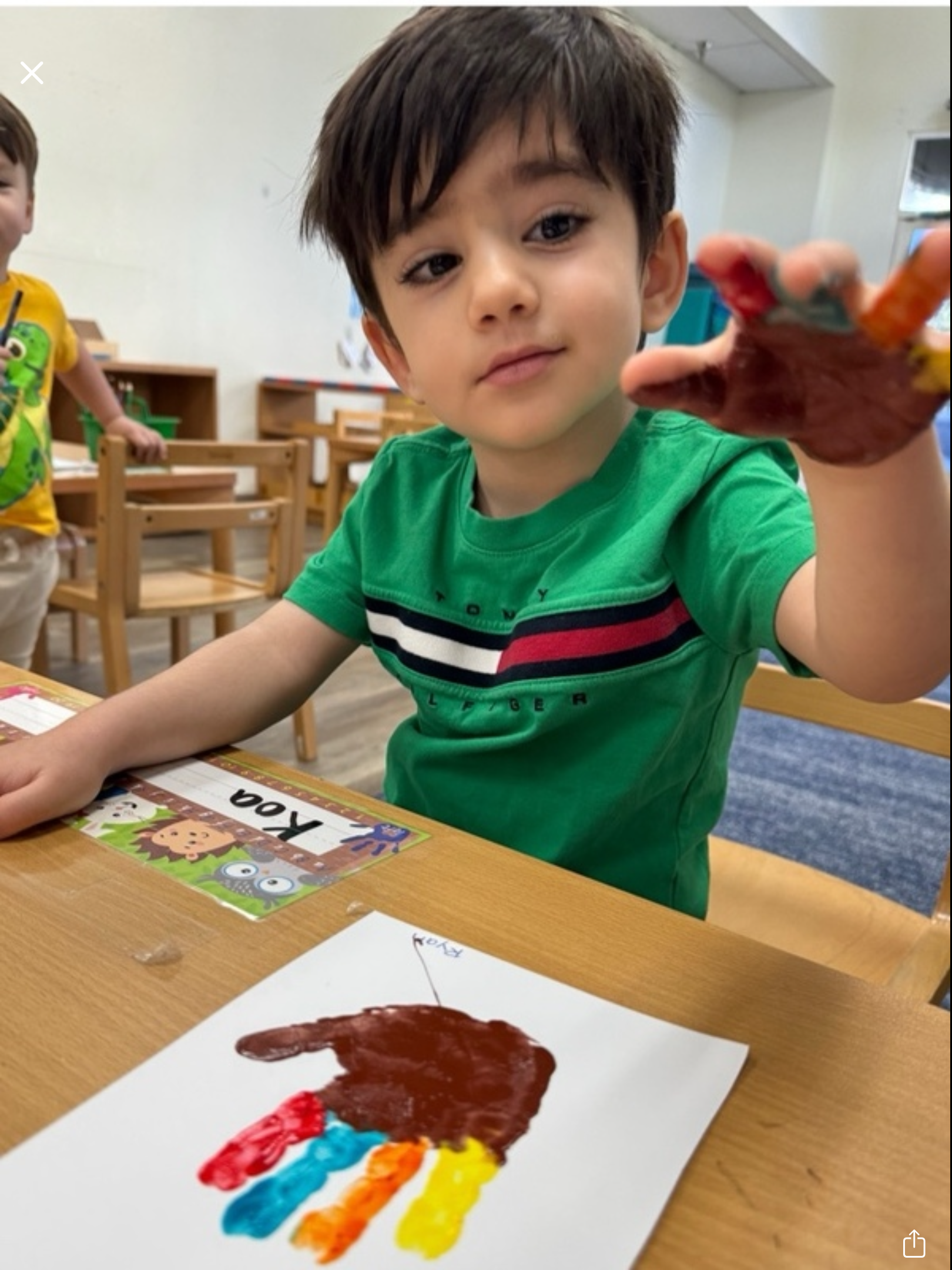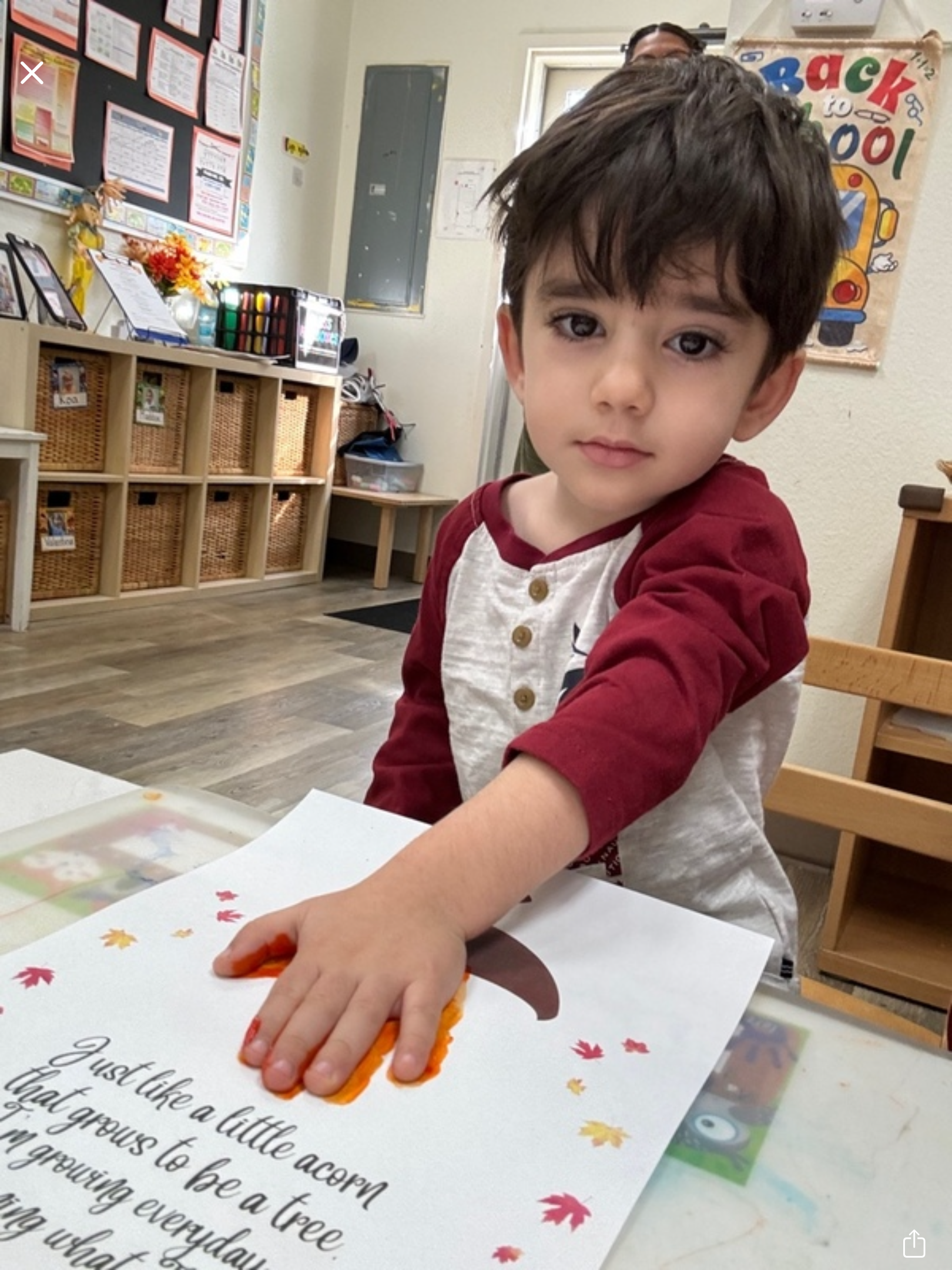 During circle time, students had the opportunity to share what their favorite vegetable or fruit was. The book of the month was Fill a Bucket which went hand–in-hand with our Empathy Program. We used the bucket concept in our daily routines by teaching students to be friendly and "bucket-filling" towards other friends or family. We focused on the letters i-k. We had items and pictures for each letter. We emphasized each letter through phonic songs and rhythms. Students also learnt about their continent, state, and country. We paid our respects to the flag of America by listening to the national anthem and the pledge of allegiance. Since Thanksgiving was in November, students used their handprints to create the turkey feathers on our door. Students also created their fall trees using cotton balls dipped in paint representing the fall leaf colors. We made an acorn by painting the students’ hands with orange paint. In Spanish class, we learned the different parts of the turkey's body. Students colored their turkeys, and then, with the teacher's assistance, they cut and pasted each word in the corresponding body part.