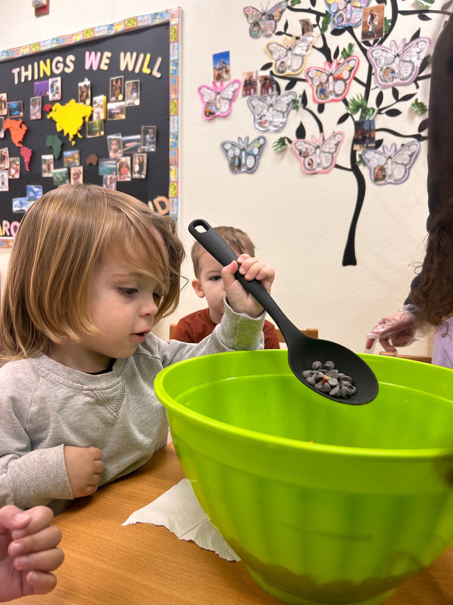 October was a spooktacular month! The students enjoyed learning all about the changes happening in the new season of Fall, such as the weather and leaves changing their colors. To celebrate the season, the students made their own leaf hunt using their handprints with orange, red, and yellow paint. They also created a leaf hunt around the whole playground where they could pick out dry leaves or leaves that were changing colors. The book of the month was Going on a Leaf Hunt by Steve Metzger. During the month, the students continued practicing their alphabet with interactive songs emphasizing phonics and relating them to objects in the world. They also practiced through dot art and a daily recap every morning.