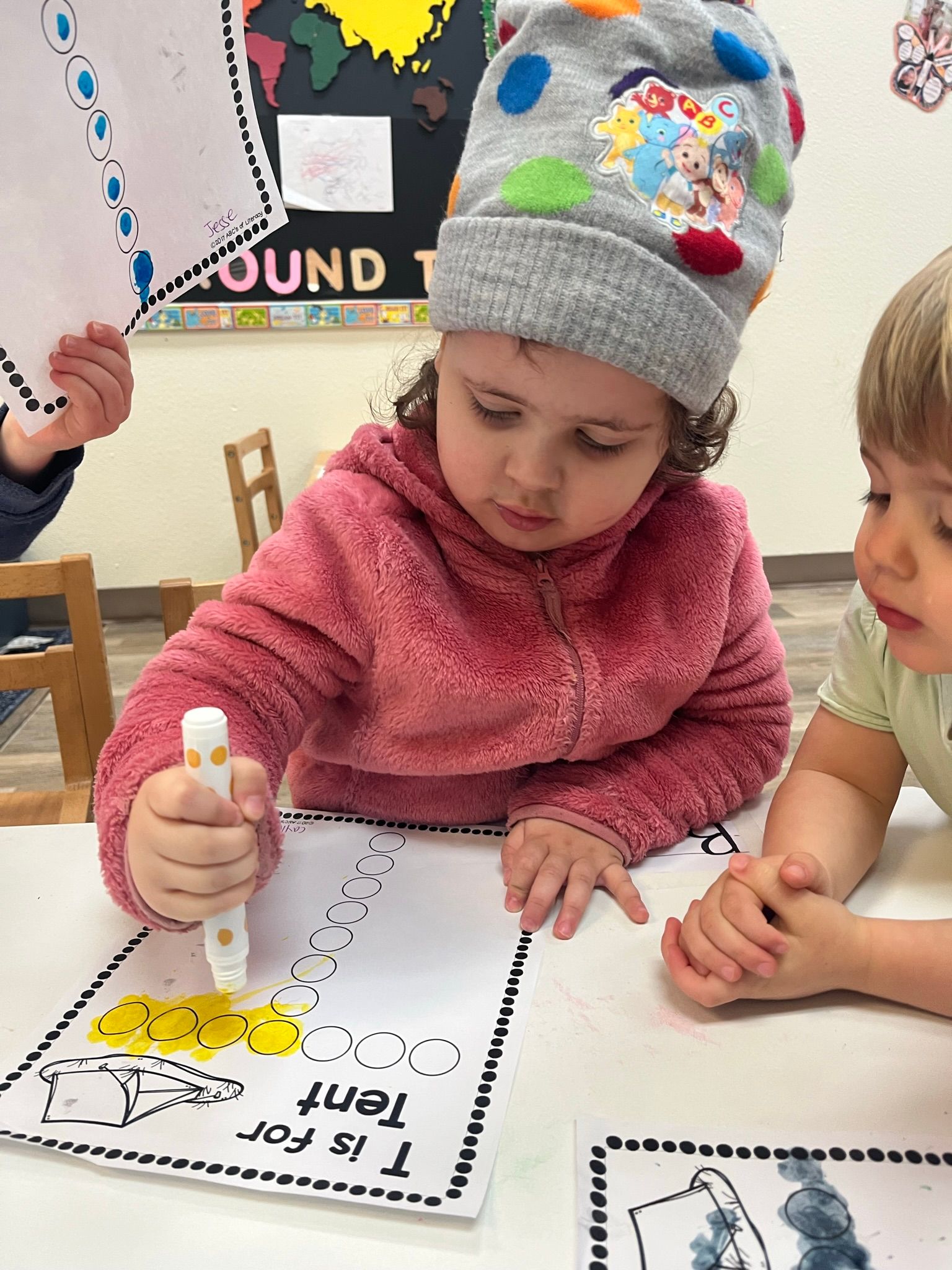 Students continue practicing their alphabet letters and numbers. We are currently on letter N and number 13! We engage in daily interactive singing, physical movement, and/or real-life comparison to expand our knowledge of the letter of the week and the number. We also did dot art of the letters L, M, and N.