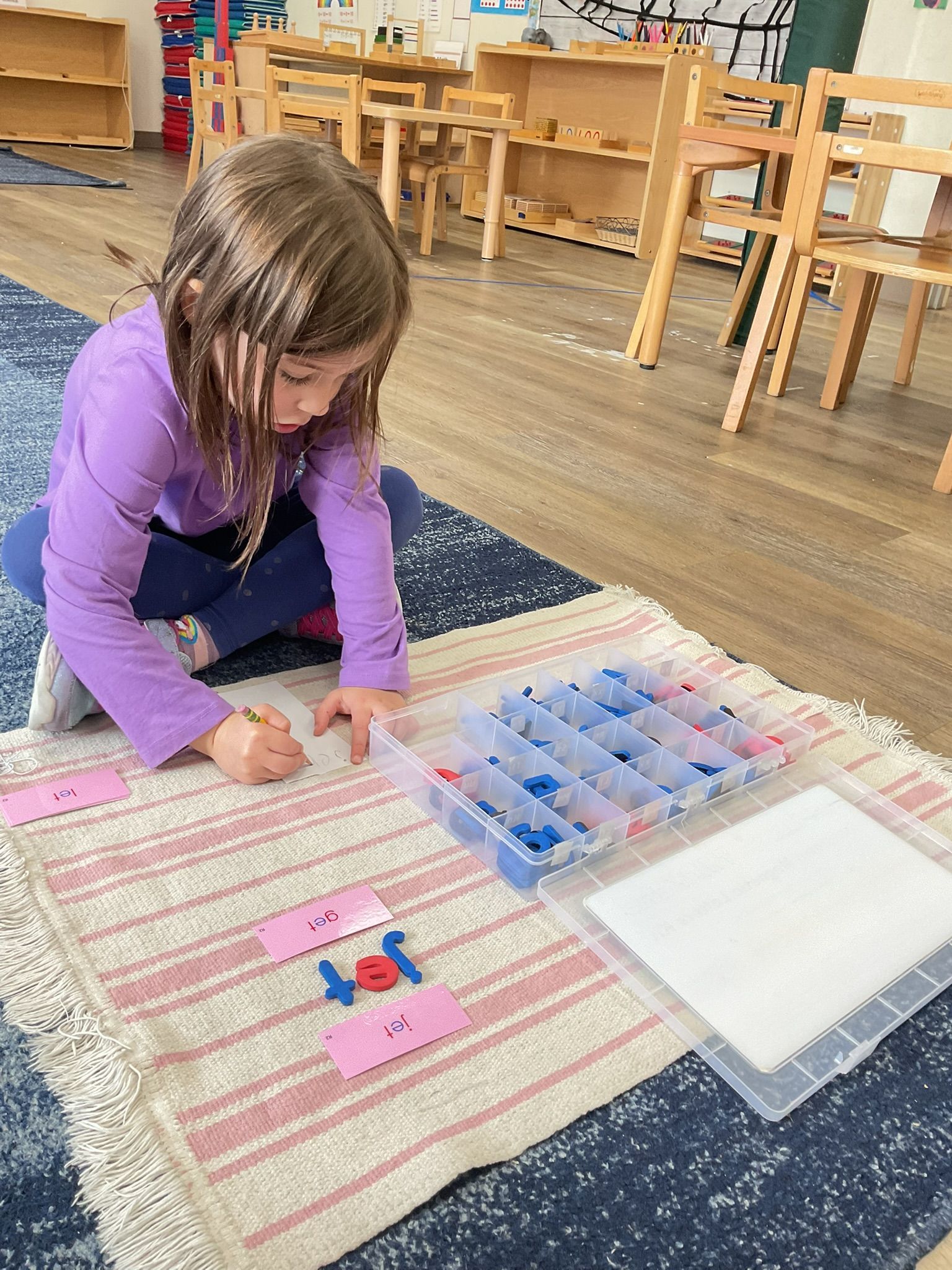 In Language, we used the moveable alphabet to create word families such as cat, bat, and hat. We also practiced blending sounds together with beginning blends like bl, st, and tr, and ending blends such as nd, mp, and st.
