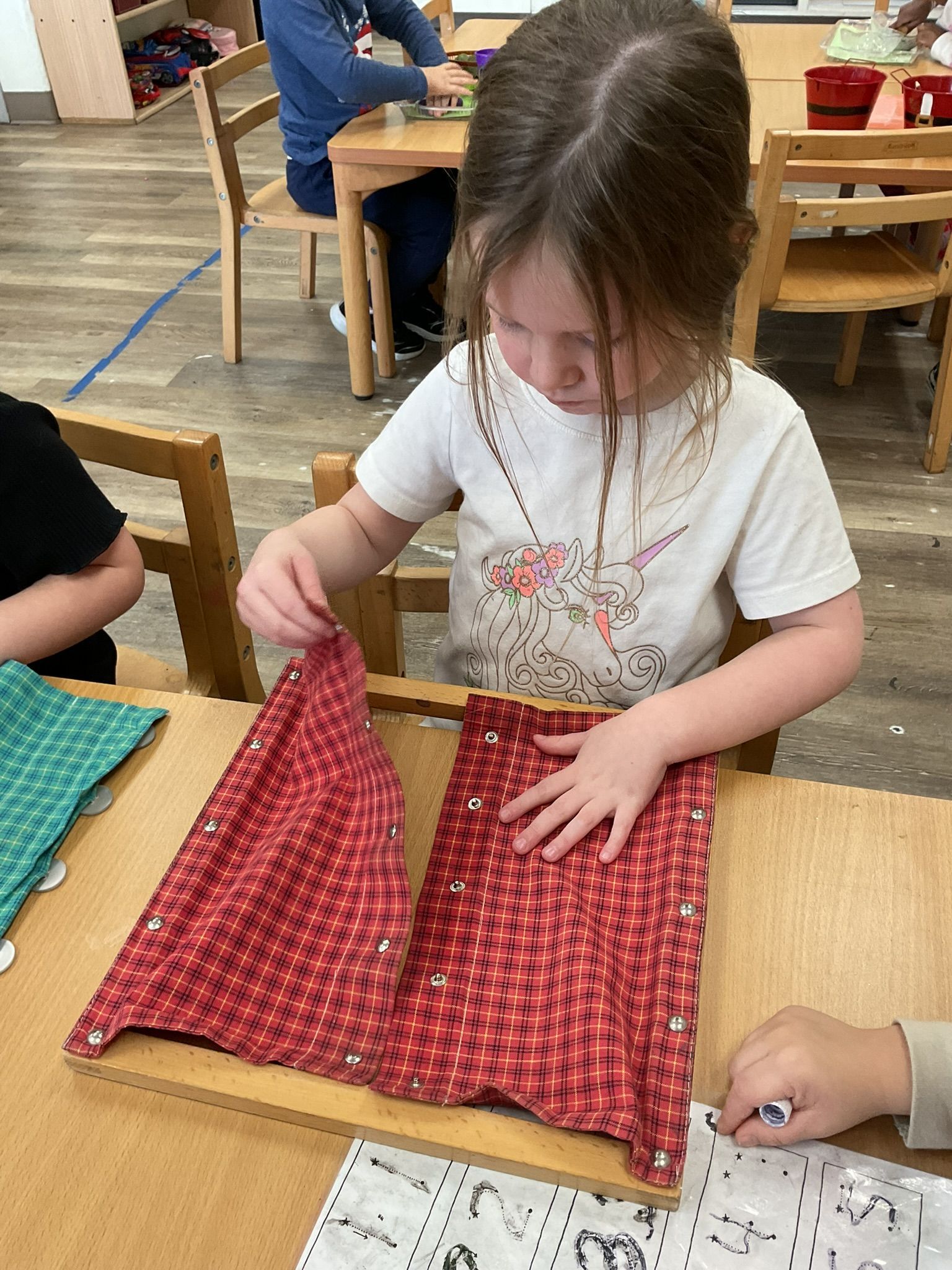 In Practical Life, we practiced moving carefully by walking on a line and greeting others politely with eye contact and handshakes. The children also learned to set the table, clean up after meals, and take care of small spills using a towel or sponge.